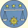 d'azur à une balance d'argent, accompagnée de trois étoiles en chef et d'une pointe de diamant du même en pointe.[3] (Il y a parfois en pointe un croissant, et la balance peut être tenue par un dextrochère mouvant du chef)[2] |