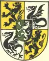 écartelé d'or au lion de sable et d'argent au dragon de sable ; sur le tout parti de sinople et de sable au lion d'argent brochant.[7] |