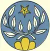de gueules à une gerbe d'or flanquée de deux étoiles du même.[réf. nécessaire] |
