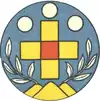 d'azur à une croix alaisée d'or, chargée d'un point de gueules en abîme, accompagnée en chef de trois besants d'argent, en pointe de deux rinceaux du même, mouvant d'un mont de trois coupeaux d'or.[4] |