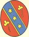 de gueules à la bande d'or chargée d'une bande d'azur (ou de sinople) surchargée de trois étoiles d'or et accompagnée de deux trèfles tigés du même.[2] |
