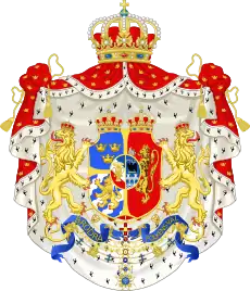 parti, en 1 coupé d'or, cantonné en chef d'azur, à trois couronnes d'or (de Suède moderne) et d'azur, à trois barres ondées d'argent, au lion couronné d'or, brochant sur le tout (de Suède ancien), en 2 de gueules, au lion couronné d'or, tenant dans ses pattes une hache danoise d'argent, emmanchée du second (de Norvège ancien) à la demi-croix de Saint-Eric, sur le tout parti de Vasa (tiercé en bande d'azur, d'argent et de gueules à la gerbe d'or brochant) et de Pontecorvo (d'azur, au pont à trois arches d'argent, sur une rivière de même, ombrée d'azur, et supportant deux tours du second ; le tout surmonté d'une aigle de sable empiétant un foudre d'or accompagné en chef de sept étoiles d'or aussi rangées en forme de la constellation de la Grande Ourse (de Bernadotte))[24].