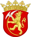 1844-1905 : Un écu carré de gueules avec un lion d'or couronné, dressé et rampant de la pointe à senestre vers le chef à dextre, la gueule ouverte et la langue tirée, brandissant dans ses pattes avant une hache de guerre à la lame d'argent, emmanchée d'or. Au-dessus de l'écu: une couronne royale[11]. |