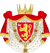 Le roi : Les armes du royaume entourées du collier de Saint Olaf et placées sous un manteau de pourpre fourré d'hermine, surmonté du même lion que l'écu, issant d'une couronne royale .