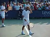 Arnaud Clément remporte le tournoi de double de Wimbledon au côté de Michaël Llodra contre la paire no 1 des frères Bob et Mike Bryan,