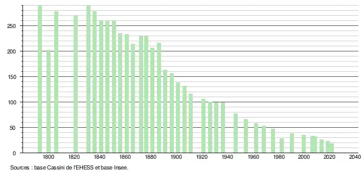L'évolution du nombre d'habitants est connue à travers les recensements de la population effectués dans la commune depuis 1793. Pour les communes de moins de 10 000 habitants, une enquête de recensement portant sur toute la population est réalisée tous les cinq ans, les populations légales des années intermédiaires étant quant à elles estimées par interpolation ou extrapolation[17]. Pour la commune, le premier recensement exhaustif entrant dans le cadre du nouveau dispositif a été réalisé en 2008[18].