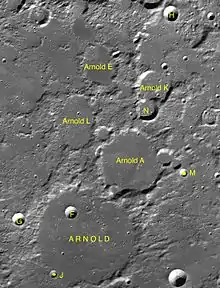 Les cratères dits satellites sont de petits cratères situés à proximité du cratère principal, ils sont nommés du même nom mais accompagné d'une lettre majuscule complémentaire (même si la formation de ces cratères est indépendante de la formation du cratère principal). Par convention, ces caractéristiques sont indiquées sur les cartes lunaires en plaçant la lettre sur le point le plus proche du cratère principal. Liste des cratères satellites de Arnold[5] :