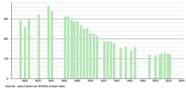 L'évolution du nombre d'habitants est connue à travers les recensements de la population effectués dans la commune depuis 1793. Pour les communes de moins de 10 000 habitants, une enquête de recensement portant sur toute la population est réalisée tous les cinq ans, les populations légales des années intermédiaires étant quant à elles estimées par interpolation ou extrapolation[20]. Pour la commune, le premier recensement exhaustif entrant dans le cadre du nouveau dispositif a été réalisé en 2008[21].