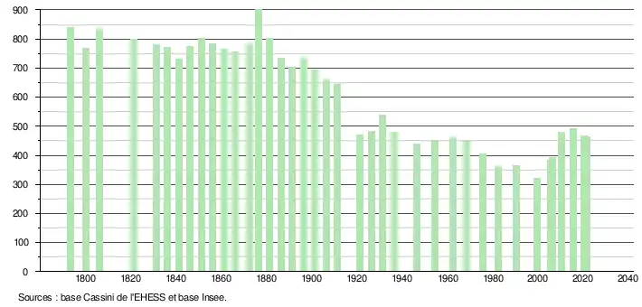 L'évolution du nombre d'habitants est connue à travers les recensements de la population effectués dans la commune depuis 1793. Pour les communes de moins de 10 000 habitants, une enquête de recensement portant sur toute la population est réalisée tous les cinq ans, les populations légales des années intermédiaires étant quant à elles estimées par interpolation ou extrapolation[19]. Pour la commune, le premier recensement exhaustif entrant dans le cadre du nouveau dispositif a été réalisé en 2005[20].