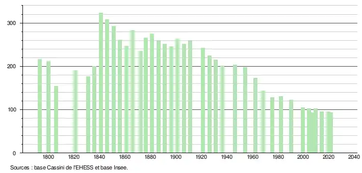 L'évolution du nombre d'habitants est connue à travers les recensements de la population effectués dans la commune depuis 1793. Pour les communes de moins de 10 000 habitants, une enquête de recensement portant sur toute la population est réalisée tous les cinq ans, les populations légales des années intermédiaires étant quant à elles estimées par interpolation ou extrapolation[48]. Pour la commune, le premier recensement exhaustif entrant dans le cadre du nouveau dispositif a été réalisé en 2004[49].