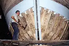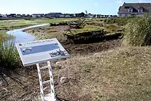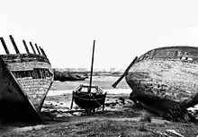 On peut apercevoir, çà et là, quelques squelettes, carcasses de bateaux en bois, membrures et morceaux de pont[8], achevant leur lente et inexorable décomposition, et, sortant des algues ou de la vase, des membrures à moitié enfouies, comme les côtes d’une baleine échouée. Une coque, toujours debout, visible même à marée haute, lentement mise à mal par les marées, résiste encore aux intempéries. Ces témoins du passé attirent toujours de nombreux artistes peintres et photographes.