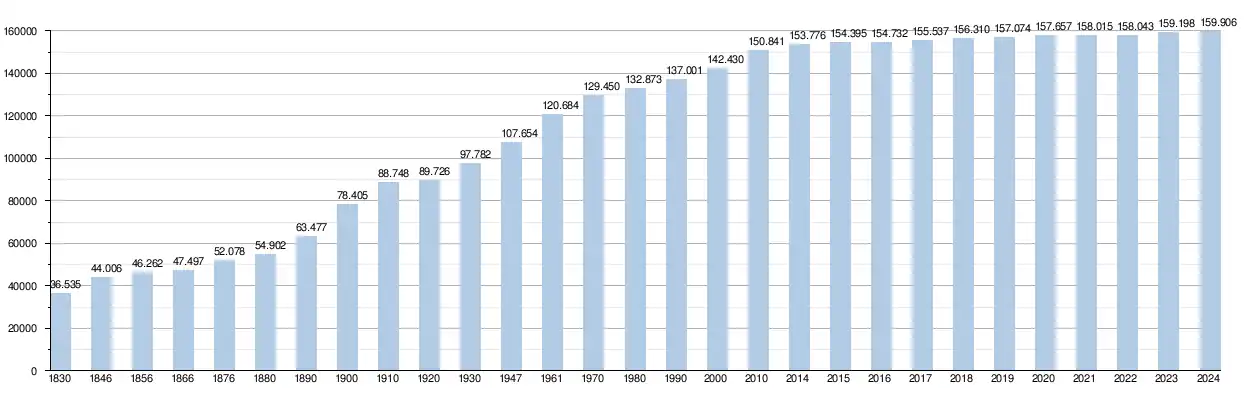 Il comptait, au , 158 270 habitants (79 375 hommes et 80 895 femmes), soit une densité de 542,76 habitants/km²[2] pour une superficie de 291,60 km².
