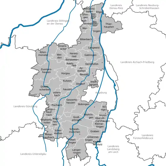 De nouvelles modifications importantes ont lieu lors des réformes administratives des années 1970. Un nouvel arrondissement d'Augsbourg est créé qui réunit les communes des anciens arrondissements d'Augsbourg et de Schwabmünchen, la moitié environ de celles de l'arrondissement de Wertingen, la commune d'Ellgau issue de l'arrondissement de Donauwörth et la commune de Thierhaupten issue de l'arrondissement de Neuburg an der Donau.