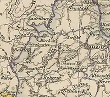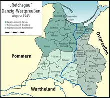 Par le biais de l'ordonnance relative à la modification des noms de lieux du Reichstatthalter en Dantzig-Prusse-Occidentale du 25 juin 1942, tous les noms de lieux sont germanisés avec l'accord du ministre de l'Intérieur du Reich. Le nom de 1918 est conservé ou, s'il nest était pas assez "allemand", il est adapté ou traduit :