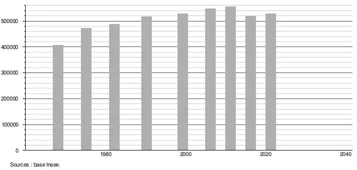 - Population municipale légale en vigueur au 1er janvier 2024, millésimée 2021, définie dans les limites territoriales en vigueur au 1er janvier 2023, date de référence statistique : 1er janvier 2021.