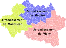 Les trois arrondissements actuels ont comme chefs-lieux : Moulins, Montluçon, Vichy.