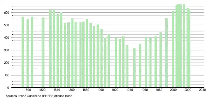 L'évolution du nombre d'habitants est connue à travers les recensements de la population effectués dans la commune depuis 1793. Pour les communes de moins de 10 000 habitants, une enquête de recensement portant sur toute la population est réalisée tous les cinq ans, les populations légales des années intermédiaires étant quant à elles estimées par interpolation ou extrapolation[29]. Pour la commune, le premier recensement exhaustif entrant dans le cadre du nouveau dispositif a été réalisé en 2004[30].
