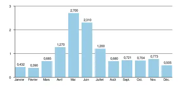Les crues ne sont pas très importantes, compte tenu de la petitesse du bassin versant. La série des QIX n'a pas été calculée, mais la série des QJX a été. Les QJX 2 et QJX 5 valent respectivement 7,1 et 8,7 m3/s. Le QJX 10 est de 9,8 m3/s, le QJX 20 de 11 m3/s, tandis que le QJX 50 se monte à 12 m3/s.