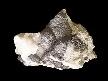 Arsenic natif avec calcite blanche et reliquat de quartz, Sainte-Marie-aux-Mines, Musée d'histoire naturelle de Londres | |