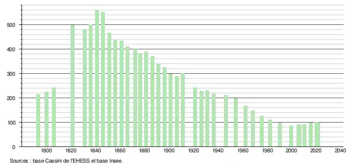 L'évolution du nombre d'habitants est connue à travers les recensements de la population effectués dans la commune depuis 1793. Pour les communes de moins de 10 000 habitants, une enquête de recensement portant sur toute la population est réalisée tous les cinq ans, les populations légales des années intermédiaires étant quant à elles estimées par interpolation ou extrapolation[16]. Pour la commune, le premier recensement exhaustif entrant dans le cadre du nouveau dispositif a été réalisé en 2005[17].