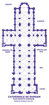 La construction de la cathédrale de Durham commence en 1093 et jusqu'en 1104 sont réalisés : le chœur, le croisillon sud du transept en entier, mais sans les voûtes, le croisillon nord jusqu'au sommet de l'étage des tribunes et deux travées de la nef. De 1104 à la dédicace de 1033, le transept est terminé ainsi que la nef entièrement voûtée. L'avant-nef est de 1175 et les tours de l'ouest sont terminées en 1226. Le chœur est profondément remanié à l'époque gothique et la tour de la croisée du transept, endommagée par la foudre reconstruite entre 1470 et 1490<[9].