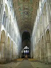 La cathédrale d'Ely est commencée alors qu'elle n'est qu'une abbatiale par l'abbé Siméon (1081-1093) et les travaux débutent par le chœur qui est reconstruit à l'époque gothique. Le transept est conservé à l'exception de la tour-lanterne construite entre 1328 et 1340. La nef de douze travées est élevée pendant les deux premiers tiers du XIIe siècle avec l'emploi de piliers faibles et forts et d'une élévation à trois niveaux. Elle est complétée par un transept ouest avec une tour centrale et des absidioles latérales orientées qui sont des années 1174-1189 soit dans la phase finale du style roman[7].