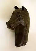 | À gauche, un chaudron avec des figures de taureaux, découvert dans le raïon de Vana. Au-dessus, un chaudron découvert dans des fouilles en Phrygie en Turquie occidentale, mais qui est classé malgré tout parmi les découvertes dans l'art Urartu. Cette figurine qui décore le chaudron est probablement une représentation du dieu d'Urartu du soleil appelé Chivini[2]. |