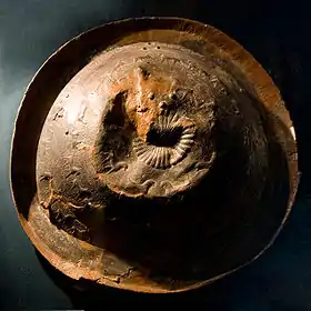 | Parure féminine en argent (pectoral) avec une représentation du dieu Haldi (sur le trône) et son épouse, la déesse urartienne Arubani. Le pectoral est conservé par un musée de Berlin. | Couvercle de chaudron en argent garni d'une figure représentant une grenade. Mentionné comme propriété du tsar Argishti Ier, Musée d'histoire de l'Arménie. |