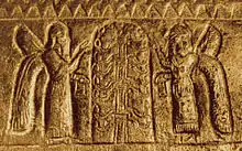 | À gauche: Vestiges d'un bas-relief important en pierre avec une représentation de la déesse Teisheba, debout sur un taureau. Il a été découvert dans les ruines de la citadelle d'Adildjevaz, et conservés au Musée de Van; Au-dessus: Deux coffrets en pierre découverts lors des fouilles de Karmir-Blourе. Conservés au musée Erebouni à Erevan. À droite : représentation d'un griffon et d'un disque ailé. | ||||