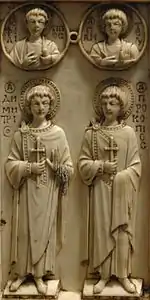L'icône de l'archange saint Michel, conservé à Venise, dans le trésor de Saint-Marc, date du Xe siècle et est réalisée en or et argent doré, les décors étant réalisés en émail cloisonné sur or, au repoussé (visage) et avec des pierres semi-précieuses ou précieuses. Elle présente un panel de toutes les techniques existant antérieurement qui atteignent à cette époque leur apogée. Le visage de l'archange est stylisé comme au VIe siècle, ce qui correspond à un retour à l'antique volontaire : arcades sourcilières en arc de cercle, nez long et droit, yeux écarquillés, bouche menue et sinueuse.