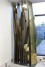| Bilodeau, Jacques | Un solide | 2015 | Laiton et acier | Ensemble de plaques de laiton verticales reflétant la lumière. Hommage à Marcelle Ferron. | ![]() | ||