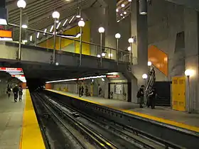 | Longueuil–Université-de-Sherbrooke | Jaune | Dumontier, Jean | Murales | 1967 | Béton | Des lignes en angle et continues gravées dans le béton se recoupent le long des murs des quais. | ![]() |