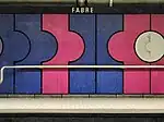 | Fabre | Bleue | Poliquin, Jean-Noël | Revêtements muraux | 1986 | Béton polymère, acier inoxydable | Tout le long de la station, une rampe tubulaire se déploie sur une murale en béton coloré. | ![]() |