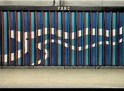 | Parc | Bleue | Desjardins, Huguette | Revêtements muraux | 1987 | Acier émaillé | Murales distribuées dans toute la station, formées de bandes verticales, colorées et plissées, et de lignes ondulantes. | ![]() |