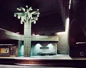| De L'Église | Verte | Théberge, Claude | Bas-reliefs | 1978 | Béton cannelé | Des lignes gravées dans le béton couvrent la station et forment des fresques dynamiques. | ![]() |
