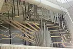 | Mousseau, Jean-Paul | Murale | 1976 | Plastique laminé, verre trempé | Alternance de 11 panneaux de plastique laminé verticaux jaunes et verts et décorés d'un motif triangulaire stylisé qui semble indiquer une direction. | ![]() | ||