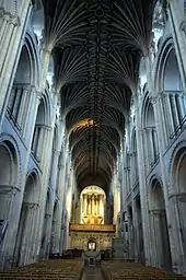 La cathédrale de Peterborough est commencée en 1118 par l'abbé Jean de Séez alors qu'elle n'est encore qu'une abbatiale. Elle développe au maximum l'amour des vides et de la lumière. Le chœur est achevé vers 1140-1143, puis le transept vers 1155-1177. La nef est construite sous l'abbatiat de Benoît (1174-1194). Au début du XIIe siècle, les deux tours sont démolies et remplacées par un transept ouest sur le modèle de celui de la cathédrale d'Ely. On y ajoute un portique colossal avec trois énormes arcs brisés cantonnés par de petites tours latérales.