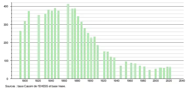 L'évolution du nombre d'habitants est connue à travers les recensements de la population effectués dans la commune depuis 1793. Pour les communes de moins de 10 000 habitants, une enquête de recensement portant sur toute la population est réalisée tous les cinq ans, les populations légales des années intermédiaires étant quant à elles estimées par interpolation ou extrapolation[17]. Pour la commune, le premier recensement exhaustif entrant dans le cadre du nouveau dispositif a été réalisé en 2007[18].