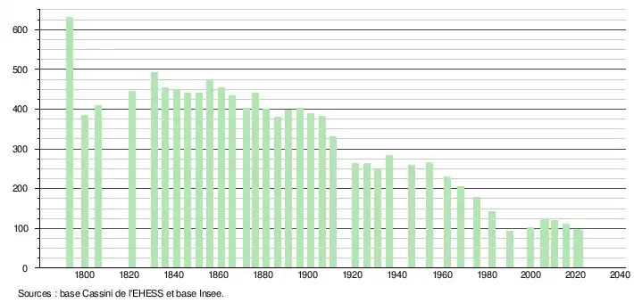 L'évolution du nombre d'habitants est connue à travers les recensements de la population effectués dans la commune depuis 1793. Pour les communes de moins de 10 000 habitants, une enquête de recensement portant sur toute la population est réalisée tous les cinq ans, les populations légales des années intermédiaires étant quant à elles estimées par interpolation ou extrapolation[26]. Pour la commune, le premier recensement exhaustif entrant dans le cadre du nouveau dispositif a été réalisé en 2005[27].