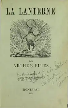 En janvier 1868, après un passage de quelques mois à Paris où il a tenté sans succès de faire carrière comme homme de lettres, Buies choisit de revenir à Montréal[17]. Il s'inspire de La Lanterne du français Henri Rochefort pour lancee en octobre son propre journal satirique, La Lanterne canadienne. Buies souhaite en faire
