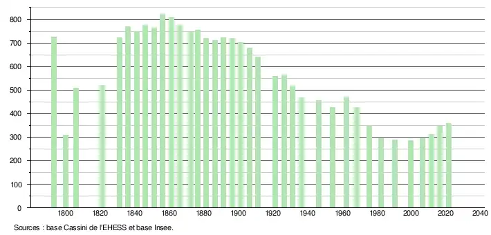 L'évolution du nombre d'habitants est connue à travers les recensements de la population effectués dans la commune depuis 1793. Pour les communes de moins de 10 000 habitants, une enquête de recensement portant sur toute la population est réalisée tous les cinq ans, les populations légales des années intermédiaires étant quant à elles estimées par interpolation ou extrapolation[26]. Pour la commune, le premier recensement exhaustif entrant dans le cadre du nouveau dispositif a été réalisé en 2006[27].