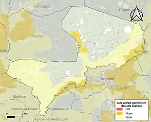 Le retrait-gonflement des sols argileux est susceptible d'engendrer des dommages importants aux bâtiments en cas d’alternance de périodes de sécheresse et de pluie. 7,6 % de la superficie communale est en aléa moyen ou fort (19,2 % au niveau départemental et 48,5 % au niveau national). Sur les 191 bâtiments dénombrés sur la commune en 2019, 43 sont en aléa moyen ou fort, soit 23 %, à comparer aux 17 % au niveau départemental et 54 % au niveau national. Une cartographie de l'exposition du territoire national au retrait gonflement des sols argileux est disponible sur le site du BRGM[22],[Carte 2].