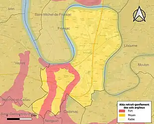 La commune fait partie du territoire à risques importants d'inondation (TRI) de Libourne, regroupant les 20 communes concernées par un risque de submersion marine ou de débordement de la Dordogne, un des 18 TRI qui ont été arrêtés fin 2012 sur le bassin Adour-Garonne[26]. Les événements significatifs aux XIXe et XXe siècles sont les crues de 1843 (6,80 m l'échelle de Libourne), de 1866 (6,40 m) et du (6,38 m) et du (6,36 m). Au XXIe siècle, les événements les plus marquants sont les crues de mars 2010 (5,55 m) et du (5,97 m). Des cartes des surfaces inondables ont été établies pour trois scénarios : fréquent (crue de temps de retour de 10 ans à 30 ans), moyen (temps de retour de 100 ans à 300 ans) et extrême (temps de retour de l'ordre de 1 000 ans, qui met en défaut tout système de protection)[27]. La commune a été reconnue en état de catastrophe naturelle au titre des dommages causés par les inondations et coulées de boue survenues en 1982, 1983, 1988, 1999, 2009 et 2021[28],[24].
