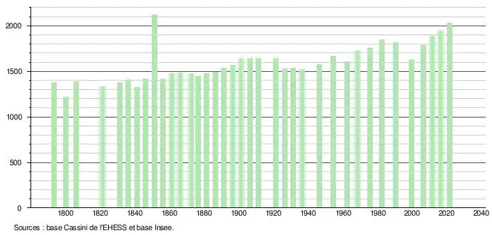 L'évolution du nombre d'habitants est connue à travers les recensements de la population effectués dans la commune depuis 1793. Pour les communes de moins de 10 000 habitants, une enquête de recensement portant sur toute la population est réalisée tous les cinq ans, les populations légales des années intermédiaires étant quant à elles estimées par interpolation ou extrapolation[40]. Pour la commune, le premier recensement exhaustif entrant dans le cadre du nouveau dispositif a été réalisé en 2006[41].