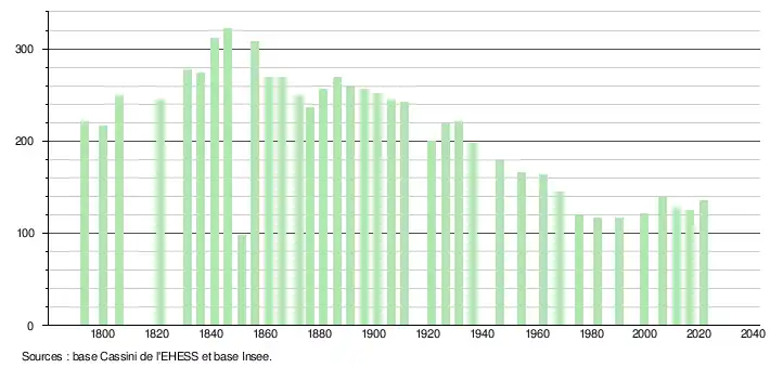 L'évolution du nombre d'habitants est connue à travers les recensements de la population effectués dans la commune depuis 1793. Pour les communes de moins de 10 000 habitants, une enquête de recensement portant sur toute la population est réalisée tous les cinq ans, les populations légales des années intermédiaires étant quant à elles estimées par interpolation ou extrapolation[44]. Pour la commune, le premier recensement exhaustif entrant dans le cadre du nouveau dispositif a été réalisé en 2006[45].