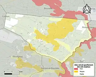 Le retrait-gonflement des sols argileux est susceptible d'engendrer des dommages importants aux bâtiments en cas d’alternance de périodes de sécheresse et de pluie. 23,1 % de la superficie communale est en aléa moyen ou fort (19,2 % au niveau départemental et 48,5 % au niveau national). Sur les 80 bâtiments dénombrés sur la commune en 2019, 21 sont en aléa moyen ou fort, soit 26 %, à comparer aux 17 % au niveau départemental et 54 % au niveau national. Une cartographie de l'exposition du territoire national au retrait gonflement des sols argileux est disponible sur le site du BRGM[20],[Carte 2].