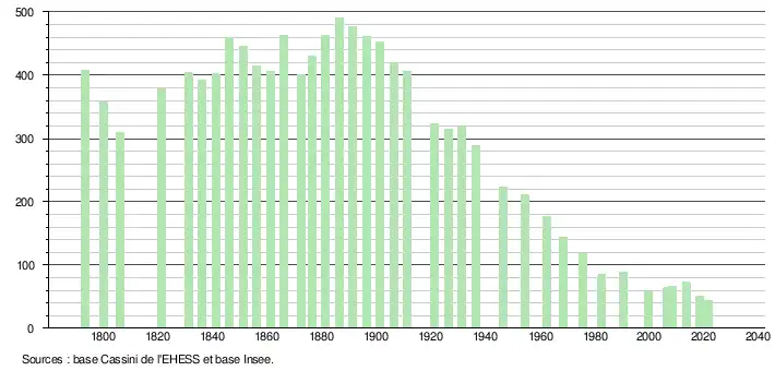 | L'évolution du nombre d'habitants est connue à travers les recensements de la population effectués dans la commune depuis 1793. Pour les communes de moins de 10 000 habitants, une enquête de recensement portant sur toute la population est réalisée tous les cinq ans, les populations légales des années intermédiaires étant quant à elles estimées par interpolation ou extrapolation[23]. Pour la commune, le premier recensement exhaustif entrant dans le cadre du nouveau dispositif a été réalisé en 2008[24]. En 2021, la commune comptait 44 habitants[Note 3], en diminution de 39,73 % par rapport à 2015 (Landes : +4,9 %, France hors Mayotte : +1,84 %). |