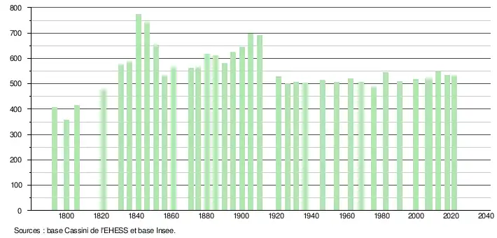 L'évolution du nombre d'habitants est connue à travers les recensements de la population effectués dans la commune depuis 1793. Pour les communes de moins de 10 000 habitants, une enquête de recensement portant sur toute la population est réalisée tous les cinq ans, les populations légales des années intermédiaires étant quant à elles estimées par interpolation ou extrapolation[20]. Pour la commune, le premier recensement exhaustif entrant dans le cadre du nouveau dispositif a été réalisé en 2007[21].