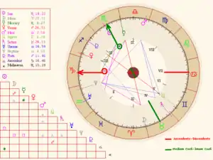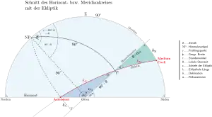 Le point ascendant est le point d'intersection vers l'est[6] entre l'horizon[7] et l'écliptique[8]. Si le Soleil franchit l'horizon Est (il se lève), comme le Soleil est par définition toujours sur l'écliptique, il coïncide alors avec l'ascendant. L'horizon et l'écliptique ont un second point d'intersection vers l'Ouest appelé point Descendant. Si le Soleil franchit l'horizon Ouest (il se couche), comme le Soleil est par définition toujours sur l'écliptique, il coïncide alors avec le descendant. L'ascendant et le Descendant forment par leur prolongement ce qu'on appelle la ligne d'horizon sur le cercle-photo des douze signes. Ces deux points sont toujours opposés par rapport au cercle des signes (par rapport au centre du thème) car il s'agit de points formant un axe de la sphère terrestre prolongé sur la sphère céleste (celle des signes). Il y a ainsi égalité en espace entre ce qui est au-dessus de l'horizon et ce qui est au-dessous (mais pas forcément égalité en temps de parcours des astres entre l'hémisphère diurne et l'hémisphère nocturne[9].