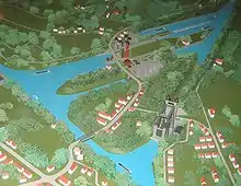 ![]() Maquette du site. De haut en bas : Nouvel ascenseur, nouvelle écluse, ancienne écluse, ancien ascenseur |